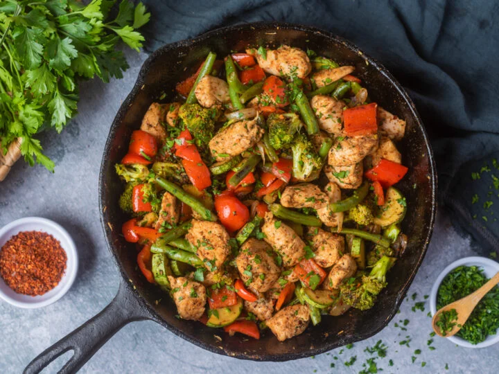 Cook the chicken in a hot skillet, add vegetables, then sauté until tender. The result delivers a balanced paleo dinner packed with protein and vegetables.