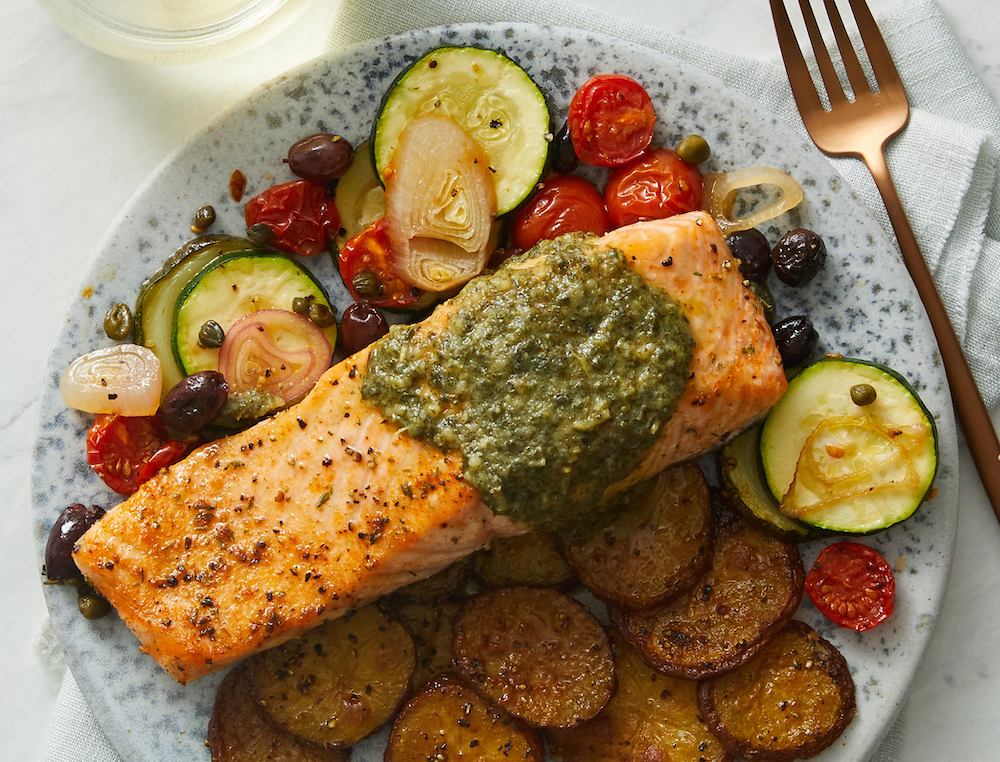 Roast everything on one tray. Salmon cooks quickly while vegetables develop flavor.