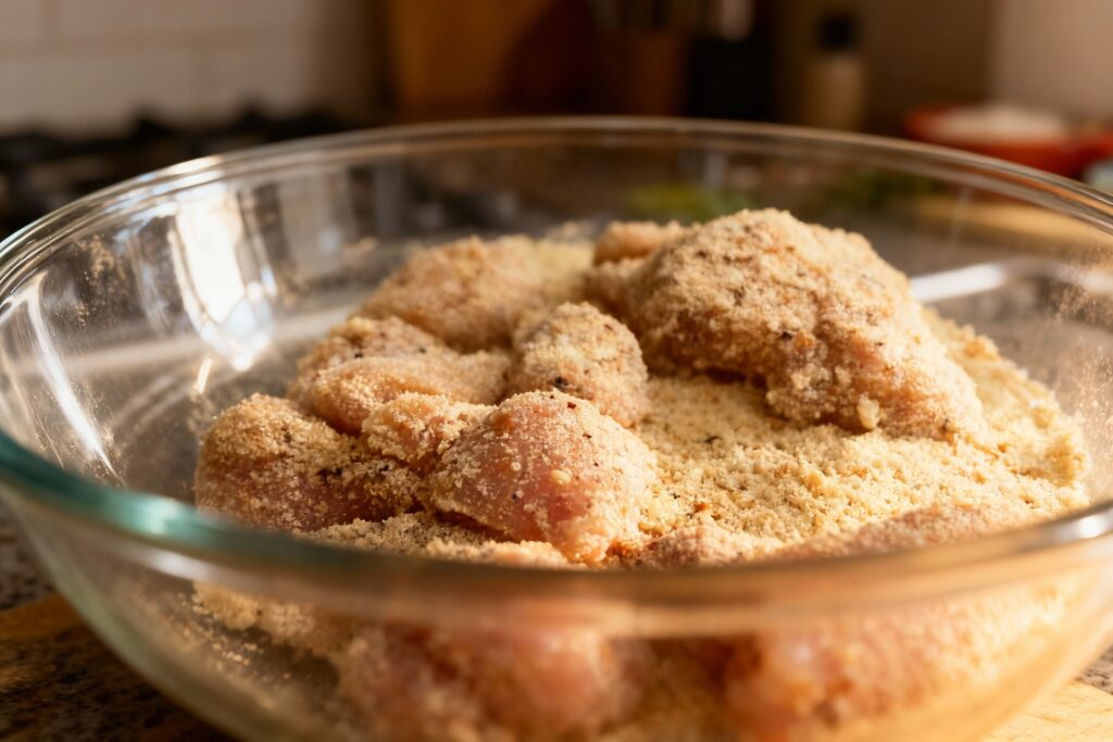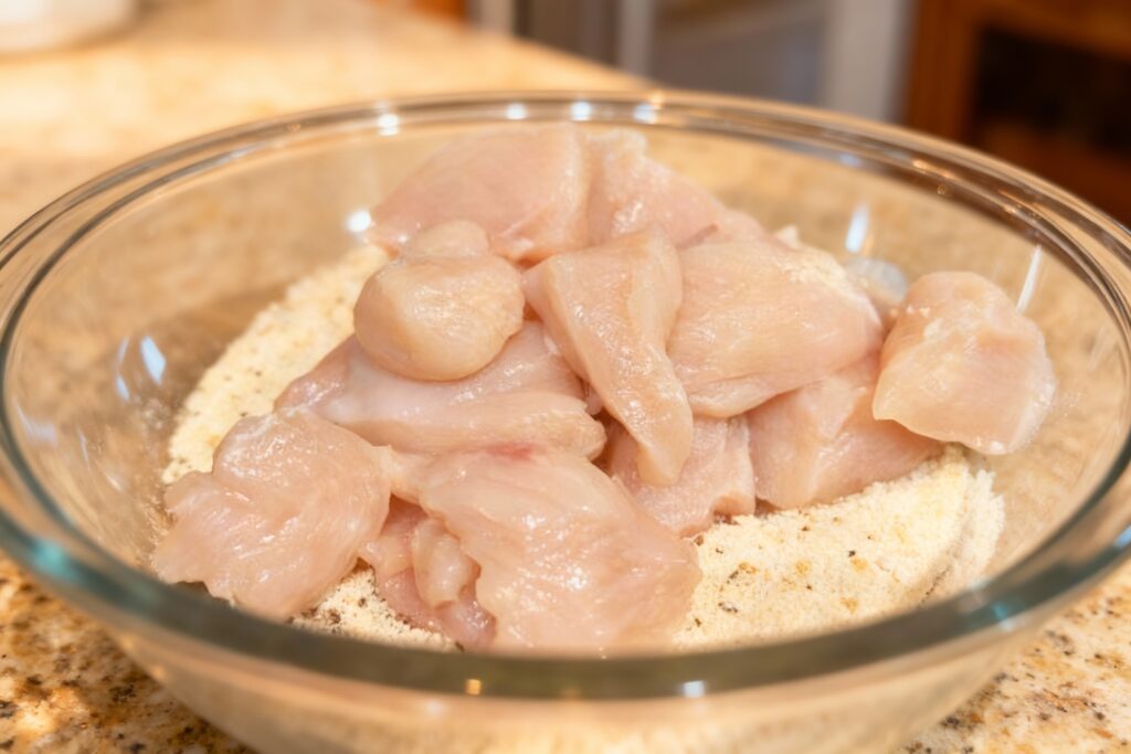 To make this recipe, the ingredients that you will need are 1 ¼ cup of bread crumbs, 1 teaspoon of salt, ½ teaspoon of garlic powder, ½ teaspoon of black pepper, 4 boneless and skinless chicken breasts that are cut into 1 ½ inch sized pieces, ¼ cup of melted unsalted butter and a bit of cooking spray.