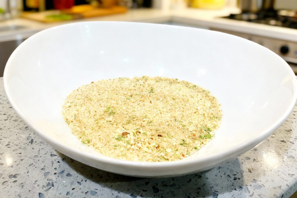 In need of a new way to cook your salmon? Try putting some breadcrumbs on it! But wait, no need to buy a whole container of breadcrumbs. There are so many foods you can use instead of prepackaged breadcrumbs. I am sure that you have a lot of food on hand that you can use for breading! Try using crackers, day-old bread, or toast. You have so many options here! Just make sure that whatever you decide to use, you pulse it for a couple of seconds with some fresh parsley. Be sure to not pulse it too long or it will turn into a powder consistency. You want a crumb texture and not a powdery texture.