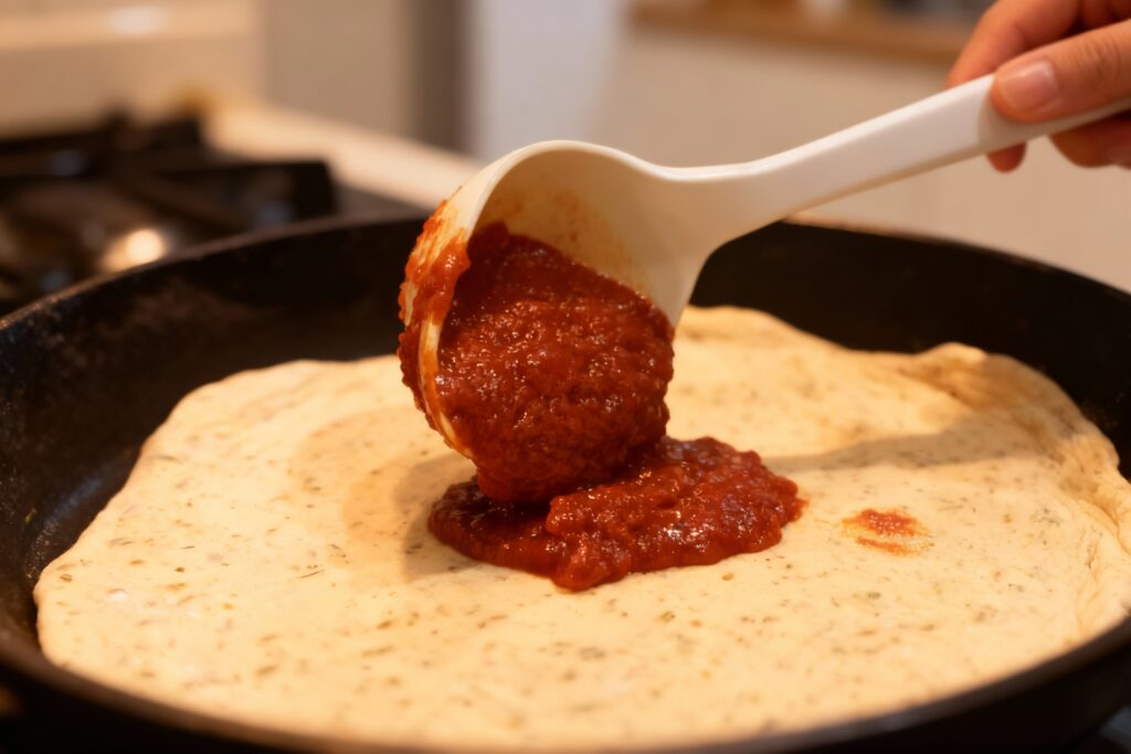 Yes, I mixed my pizza ideas to make this creation. I have made it before. It seems like each time I make this pizza, I cannot figure out if it is thick enough to be Chicago style or thin enough to be a slice of New York. Therefore, this Cast-Iron Skillet Cheese Pizza is a combination of both.