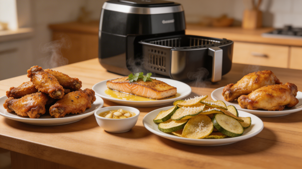 This cooking method works well for the keto diet. You focus on protein, healthy fats, and low carb vegetables while keeping preparation simple. Chicken wings, salmon, zucchini chips, and pork chops cook fast and develop strong flavor.