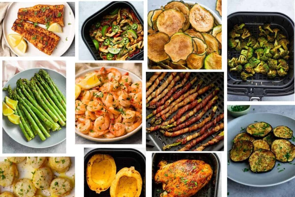 Chicken thighs, pork chops, salmon, shrimp, and steak cook evenly in air fryers. These foods also align well with keto macros.