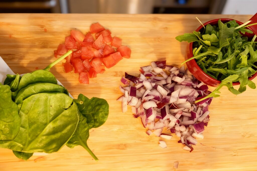 And, what I loved about making this dish is that I had everything that I needed in my refrigerator and pantry to create it. I started by chopping up half of a purple onion and half of a roma tomato. When buying your pasta, be sure to make sure it is vegan. This can be something to overlook as most pre-packaged pastas are created to be vegan Although, fresh pasta is made with eggs. The pasta’s packaging will indicate whether or not the pasta was made with eggs. Be sure to read all of the fine print to confirm!